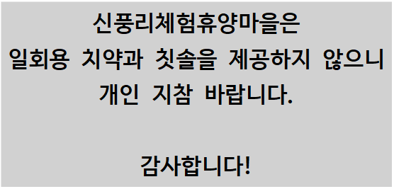 신풍리체험휴양마을은 치약, 칫솔 등 일회용품을 제공하지 않으니 개인 지참 바랍니다~